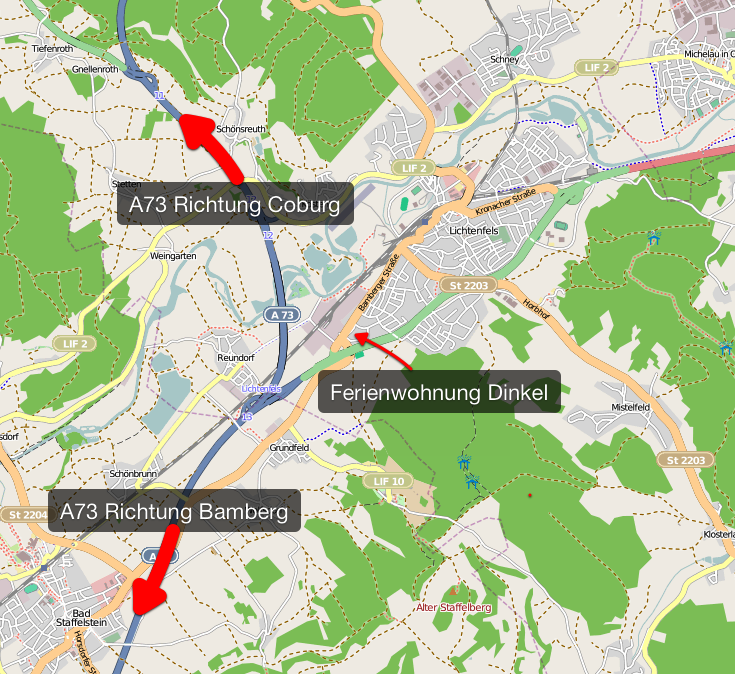 Sie fahren auf der A9 in Richtung Hof. Nehmen Sie die Ausfahrt (Naila,Selbitz,Kronach) und fahren auf der B173 Richtung Kronach/Bamberg. Auf der B173 nehmen Sie nach 65km die Ausfahrt Lichtenfels West und fahren vor der Shell Tankstelle rechts in die Seeleinstraße ein. Wir sind nach ca. 300m das erste Haus auf der linken Seite.